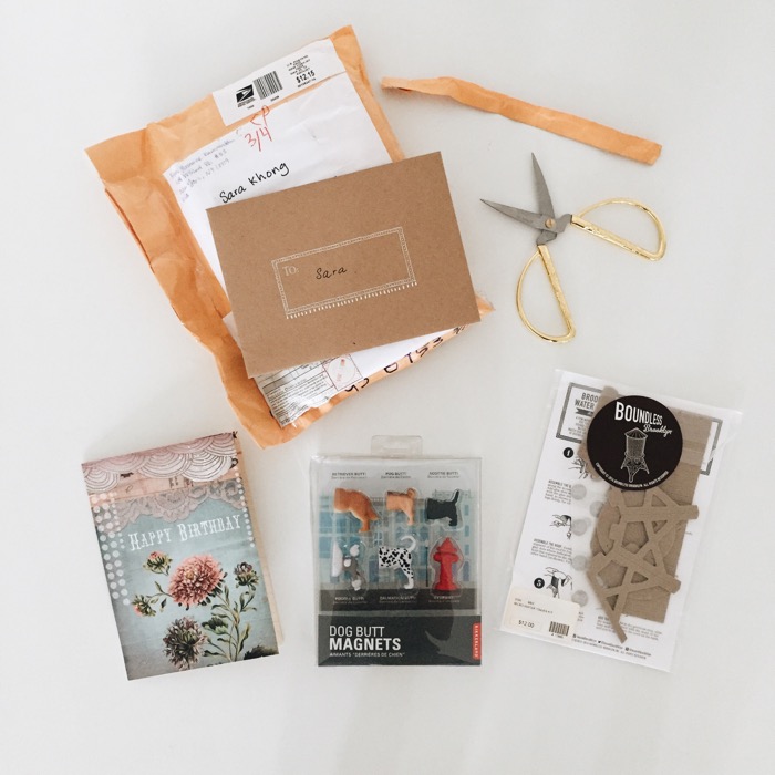 Yasmine, my first friend in primary school, sent a parcel with cool, hipster stuff: dog butt magnets, craft and a birthday card. For the past few birthdays, I’ve got multi-coloured quinoa and turkey jerky from Trader’s Joe, mini Essie nail polishes, cookbooks and beautiful necklace from local American boutiques. She gives the most thoughtful and interesting presents. Loved every of them!