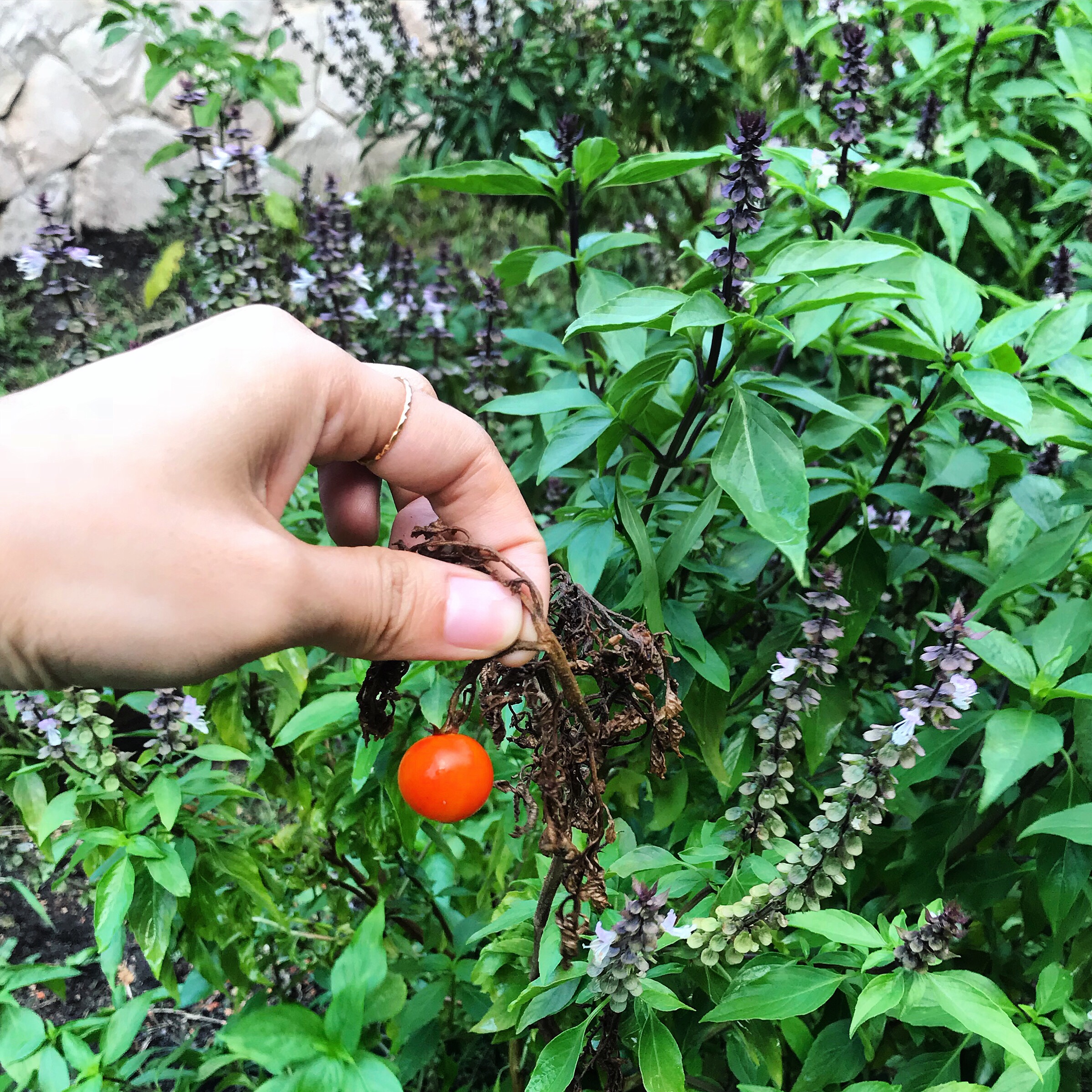 This lone tomato plant managed to grew between two bushes of basil & survived long enough to produce a fruit 🍅
